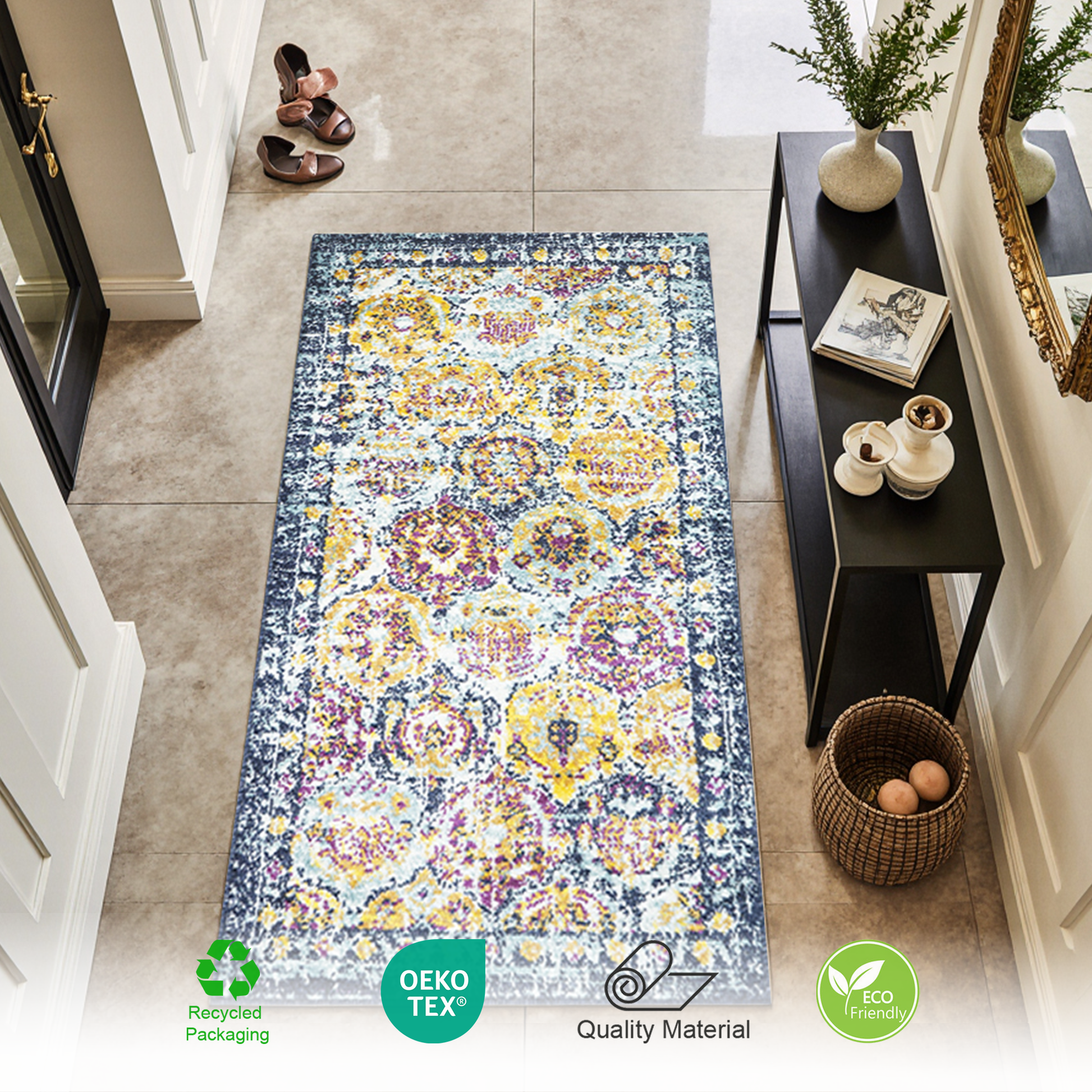 • Strong & Durable Weave: High-density woven fibres with reinforced edges maintain plushness under daily use. Eco-friendly construction and stable backing boost durability and shape retention, keeping the rug neat in lively living areas and halls.